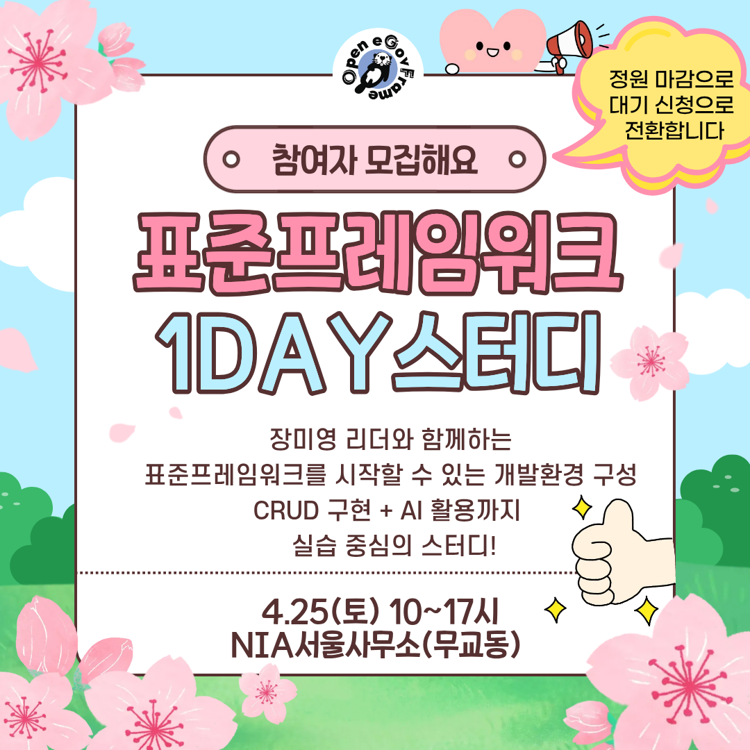 | 전자정부 표준프레임워크 1DAY(4/25.토) 스터디 대기 신청 전환 안내 | |
